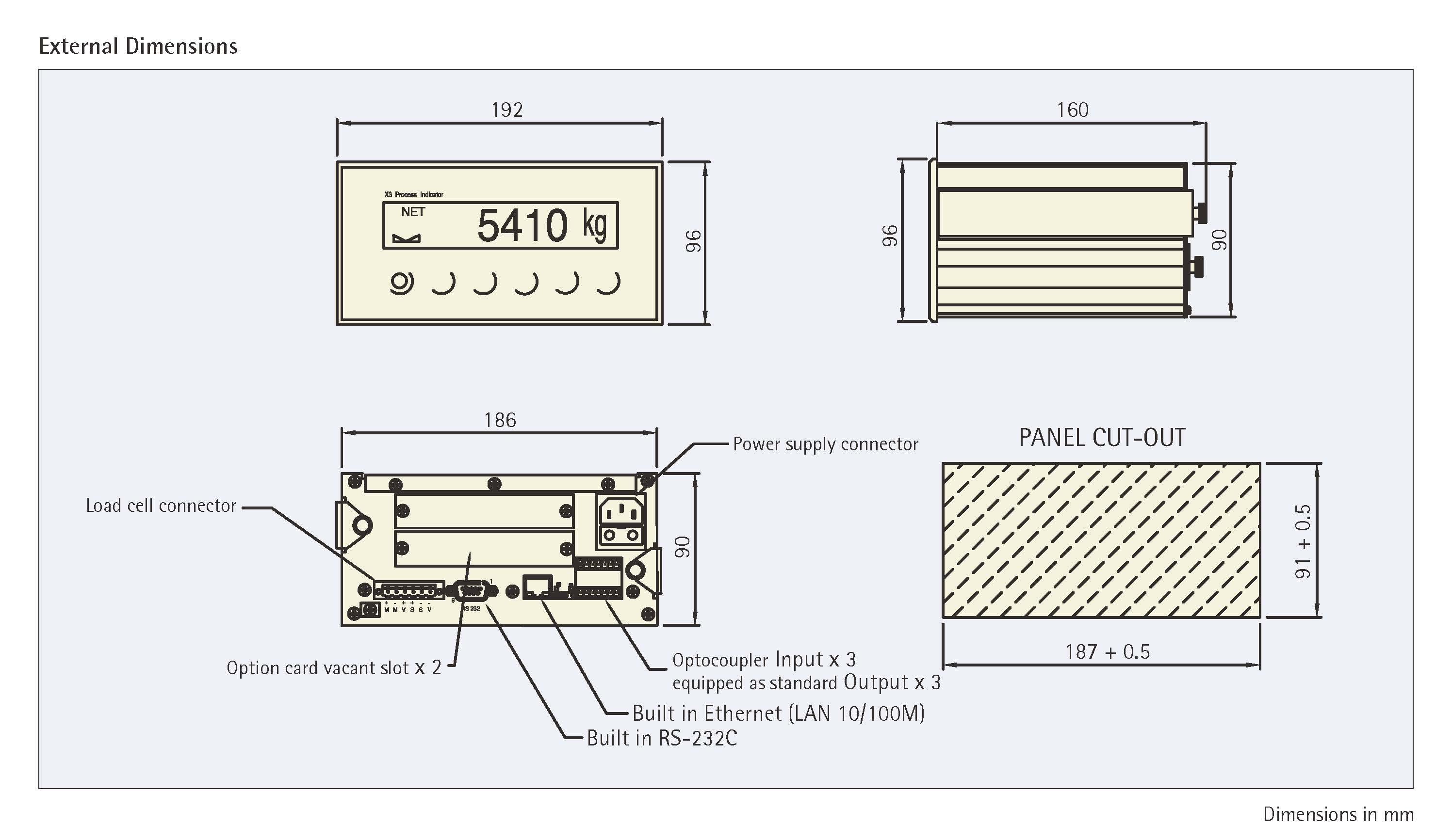 ・Load cell,control input/output optocoupler,LAN adapter connector and RS232C interfaces are mounted on the back panel