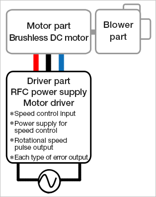 · Independent blower part and driver part: Flexible design is possible because the driver does not have to be close to the blower. Even if one part fails, the failed part can be replaced individually. This minimizes work suspension and realizes high maintainability that is impossible with a driver-integrated model.