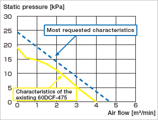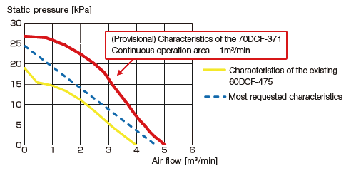 These requests have mainly concerned increases to both static pressure and air volume by about 30% from the 60DCF series, so we set a goal of doing so in our next-generation model.