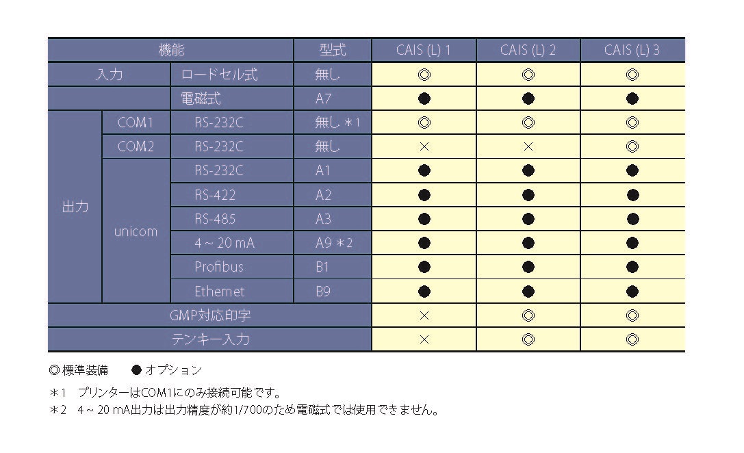 CAIS1 31250 (標準) OIML R76 Ⅲ DC8.4V(±4.2V) (標準) 83 2000 0 27.7 4.2 27.7 1/4,000,000 max. 0.672μV/e以上 (For Pind =0.5) 20mm LCD, 7デジット,14セグメント, バックライト g, kg, t, lb, ステイタスシンボルマーク AC100-240VAC(-15/+10%), 50-60Hz, 17W | 23VA max., 2mケーブル付 -10 40 85%RH以内(ただし結露無きこと) IP68/IP69K ステンレス製 JIS SUS304相当 研磨仕上 CAISL1 31250 (標準) OIML R76 Ⅲ DC8.4V(±4.2V) (標準) 83 2000 0 27.7 4.2 27.7 1/4,000,000 max. 0.672μV/e以上 (For Pind =0.5) 20mm LCD, 7デジット,14セグメント, バックライト g, kg, t, lb, ステイタスシンボルマーク AC100-240VAC(-15/+10%), 50-60Hz, 17W | 23VA max., 2mケーブル付 -10 40 85%RH以内(ただし結露無きこと) IP68/IP69K ステンレス製 JIS SUS304相当 研磨仕上 CAIS2 31250 (標準) OIML R76 Ⅲ DC8.4V(±4.2V) (標準) 83 2000 0 27.7 4.2 27.7 1/4,000,000 max. 0.672μV/e以上 (For Pind =0.5) 20mm LCD, 7デジット,14セグメント, バックライト g, kg, t, lb, ステイタスシンボルマーク AC100-240VAC(-15/+10%), 50-60Hz, 17W | 23VA max., 2mケーブル付 -10 40 85%RH以内(ただし結露無きこと) IP68/IP69K ステンレス製 JIS SUS304相当 研磨仕上 CAISL2 31250 (標準) OIML R76 Ⅲ DC8.4V(±4.2V) (標準) 83 2000 0 27.7 4.2 27.7 1/4,000,000 max. 0.672μV/e以上 (For Pind =0.5) 20mm LCD, 7デジット,14セグメント, バックライト g, kg, t, lb, ステイタスシンボルマーク AC100-240VAC(-15/+10%), 50-60Hz, 17W | 23VA max., 2mケーブル付 -10 40 85%RH以内(ただし結露無きこと) IP68/IP69K ステンレス製 JIS SUS304相当 研磨仕上 CAIS3 31250 (標準) OIML R76 Ⅲ DC8.4V(±4.2V) (標準) 83 2000 0 27.7 4.2 27.7 1/4,000,000 max. 0.672μV/e以上 (For Pind =0.5) 20mm LCD, 7デジット,14セグメント, バックライト g, kg, t, lb, ステイタスシンボルマーク AC100-240VAC(-15/+10%), 50-60Hz, 17W | 23VA max., 2mケーブル付 -10 40 85%RH以内(ただし結露無きこと) IP68/IP69K ステンレス製 JIS SUS304相当 研磨仕上 CAISL3 31250 (標準) OIML R76 Ⅲ DC8.4V(±4.2V) (標準) 83 2000 0 27.7 4.2 27.7 1/4,000,000 max. 0.672μV/e以上 (For Pind =0.5) 20mm LCD, 7デジット,14セグメント, バックライト g, kg, t, lb, ステイタスシンボルマーク AC100-240VAC(-15/+10%), 50-60Hz, 17W | 23VA max., 2mケーブル付 -10 40 85%RH以内(ただし結露無きこと) IP68/IP69K ステンレス製 JIS SUS304相当 研磨仕上 以下のテーブル内の矢印アイコンを押下していただくと、昇順から降順と順番に切り替わります。