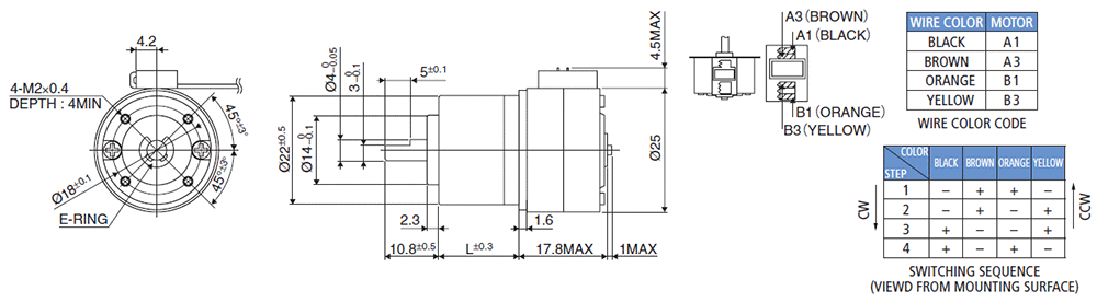 [mm]25.0 ネオジウム鉄ボンド (MS70) 100 500 400 2-2相 4.0 100M[Ω]Min. at DC500[V] AC500[V] 1[min] Class E(リード線を除く) 65 -10 50 0.03 *フランジ端面から6[mm] 0.25 -