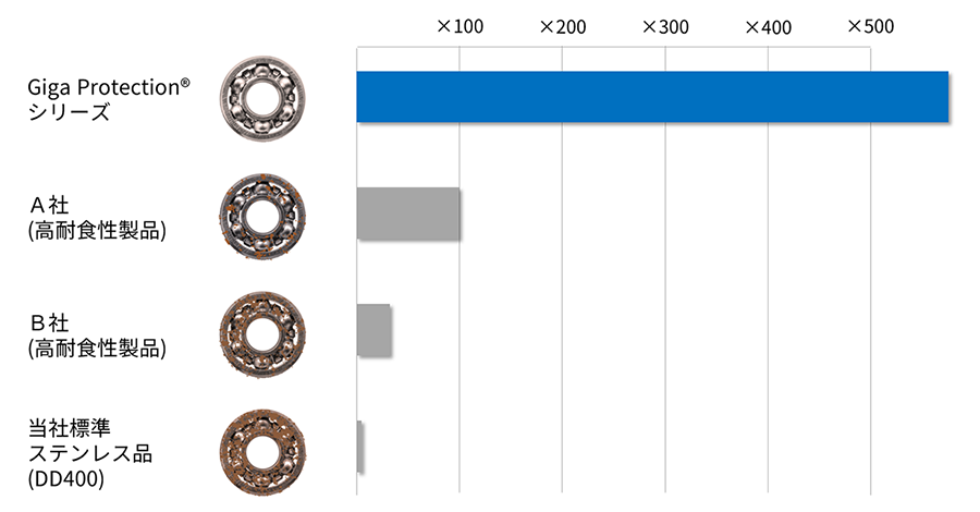 「Giga Protection®」シリーズは、特殊な高耐食鋼材の採用により、通常のステンレス鋼ベアリングに比べて、耐食・防錆性能が500倍以上向上するにもかかわらず特殊な工程が不要です。