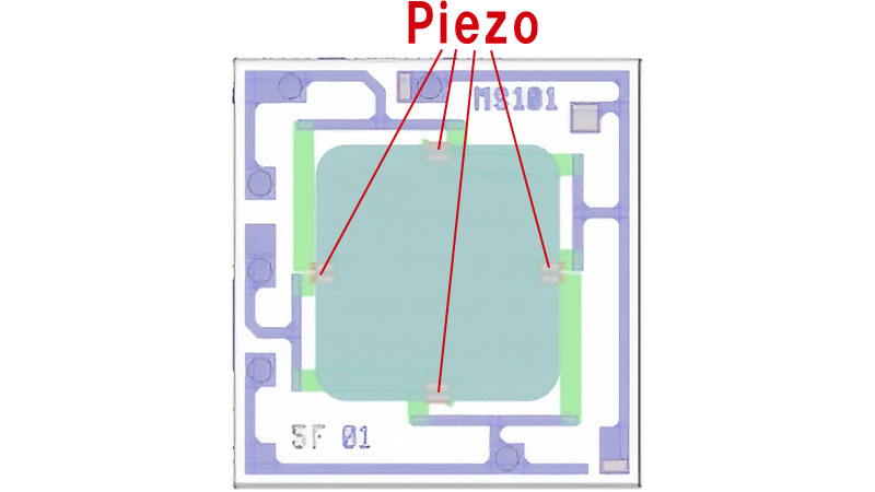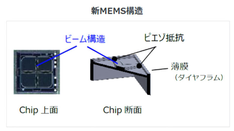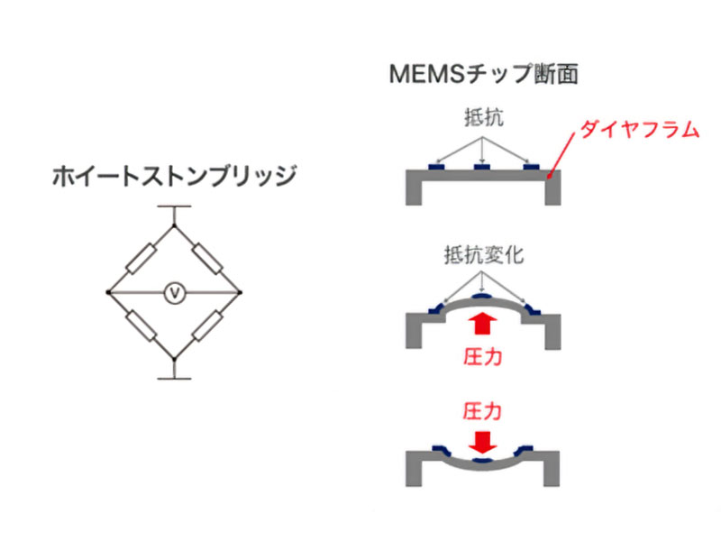 MEMSチップの薄膜(ダイヤフラム)上に、ピエゾ抵抗が配置されブリッジ回路が形成されています。