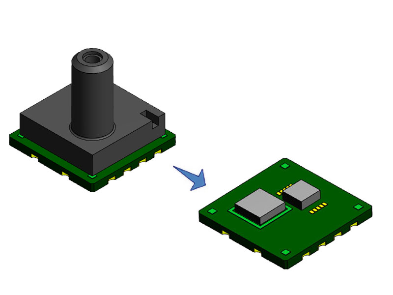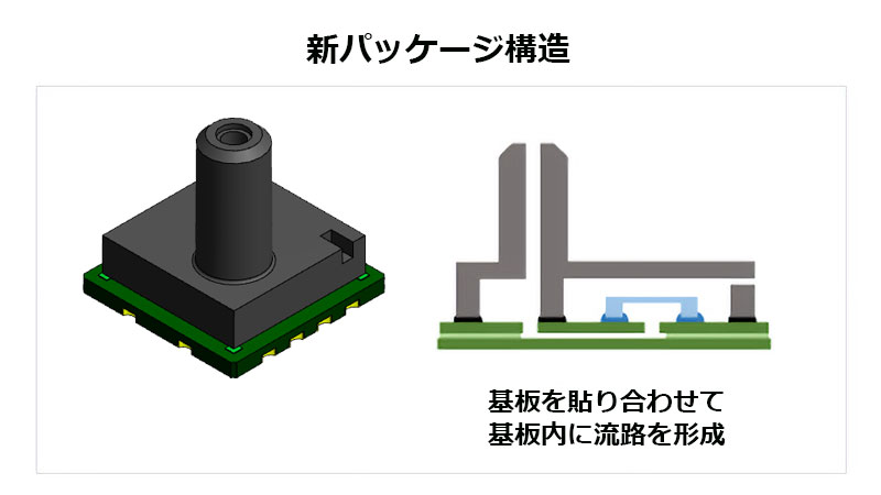 ノンリード表面実装タイプの小型パッケージでは実現が難しかったMEMSチップ裏面から受圧する構造を特許技術により実現しました。ノズル部からの湿気や異物の侵入に対する耐性を確保しつつ小型化を実現しています。